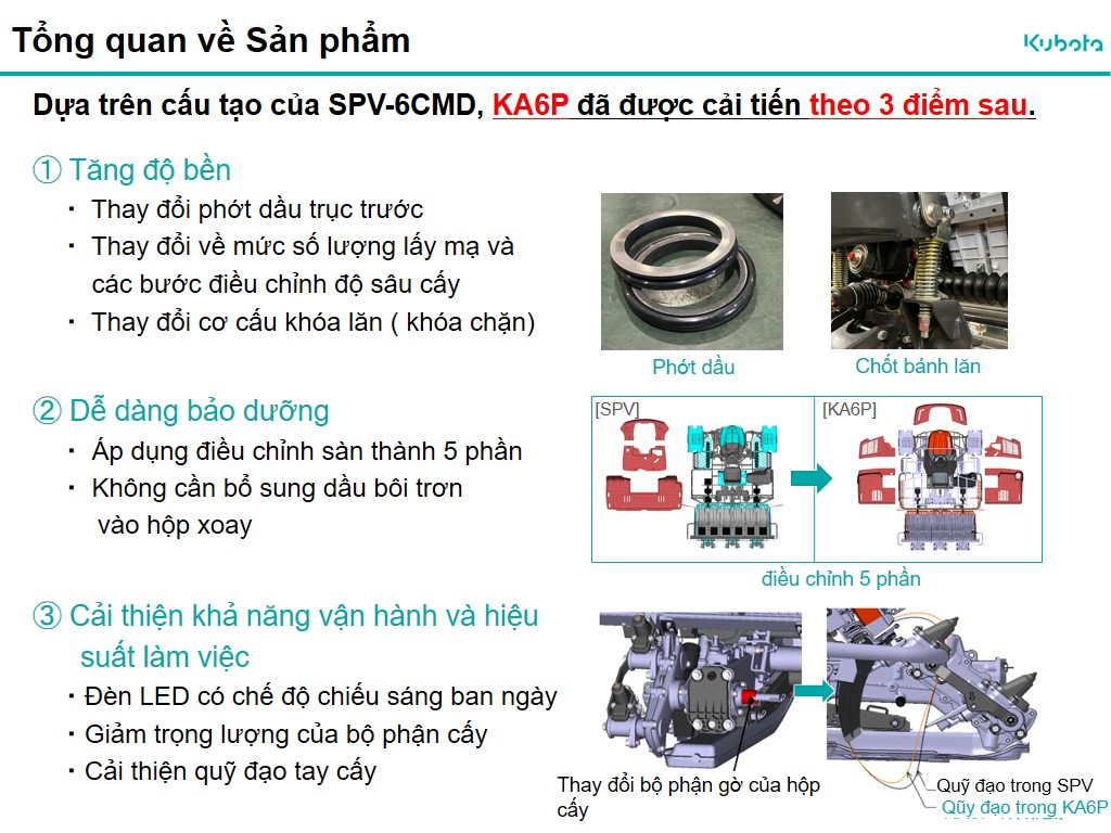 Việc thay đổi cả về ngoại hình và bộ phận cấy giúp máy cấy Kubota ngồi lái KA6P khắc phục được những nhược điểm của dòng máy cấy SPV-6CMD từ đó giúp nâng cao năng suất và hiệu suất công việc.